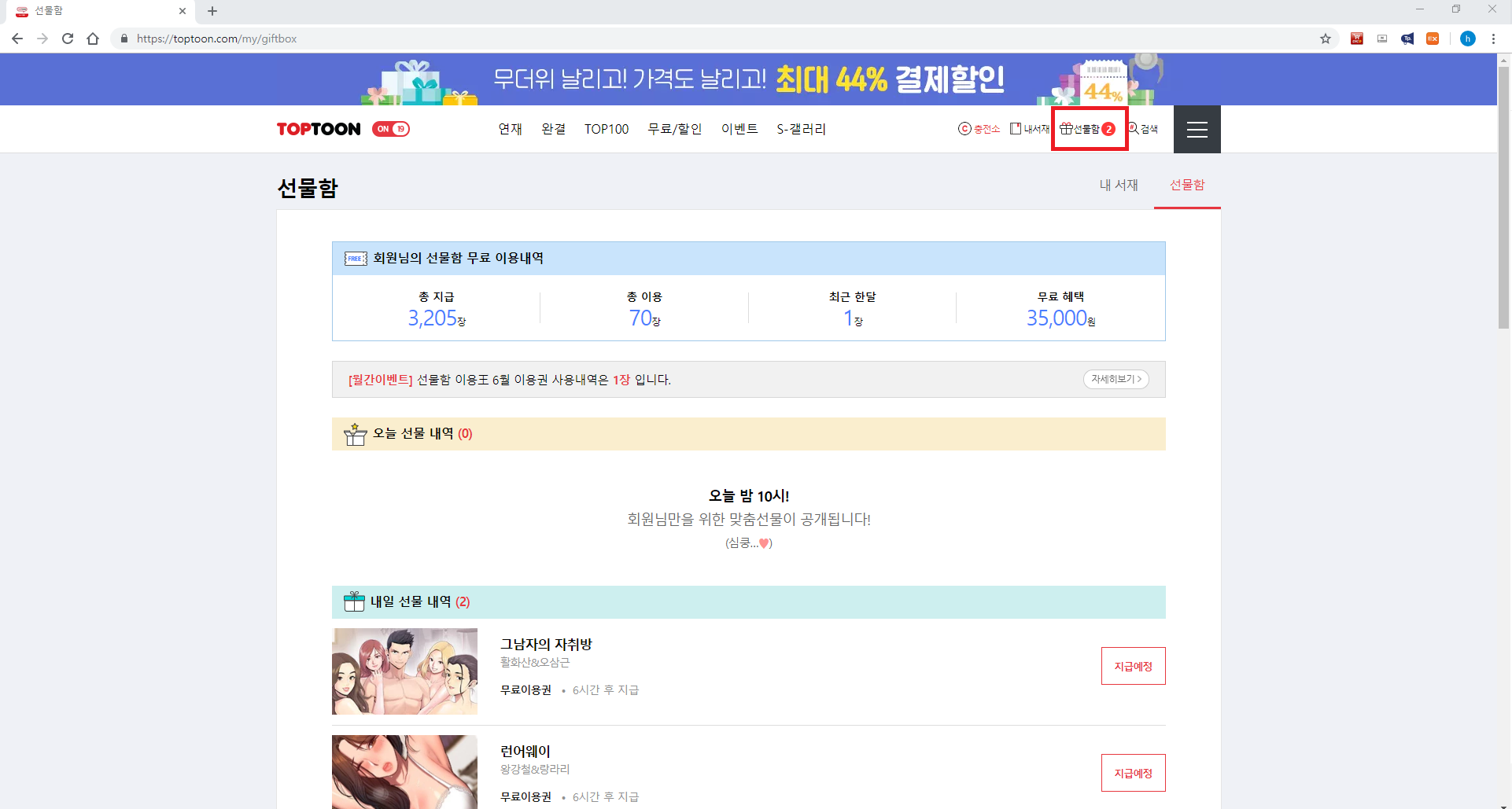 매일 저녁 10시가 되면 자동으로 선물함이 채워집니다.