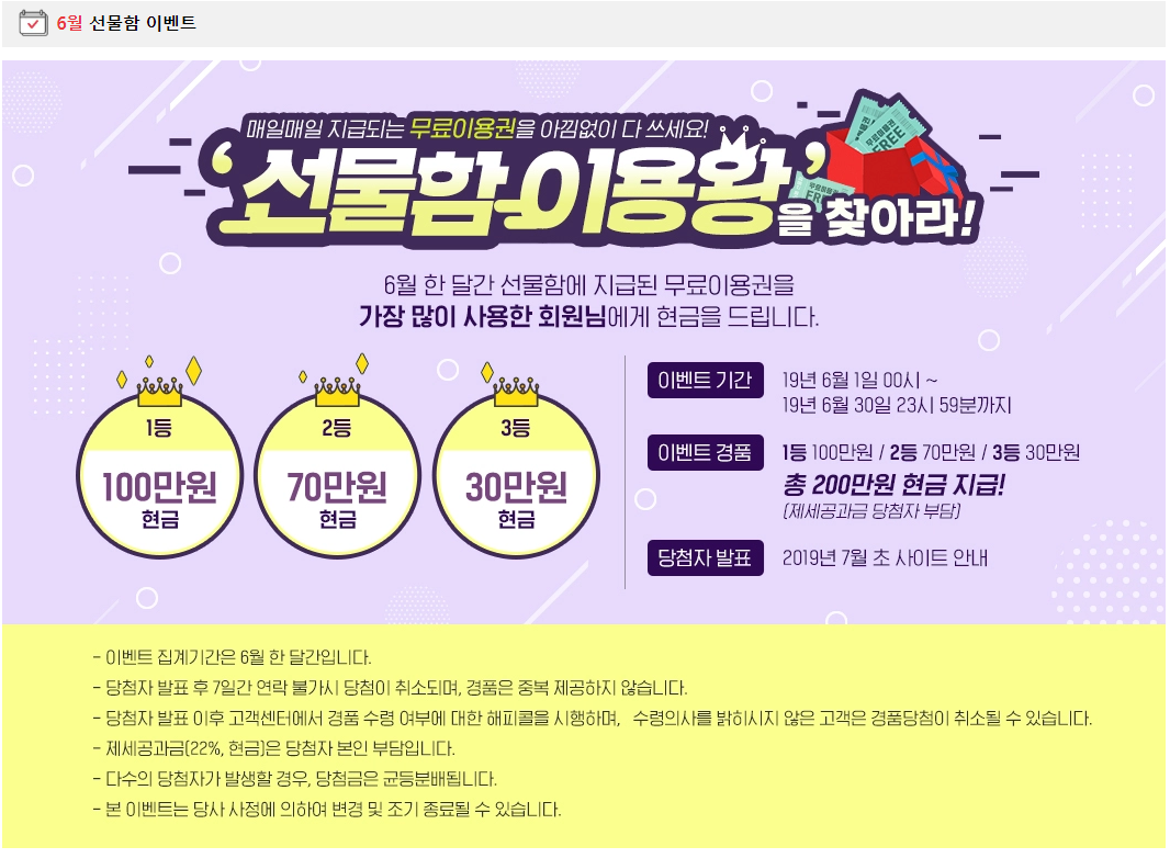 6월 이벤트로 6월 1일부터 6월 30일까지 선물함에 있는 이용권을 많이 사용하시는 분께 지급되는 것으로 웹툰도 보고 현금도 얻을 수 있는 좋은 이벤트입니다.